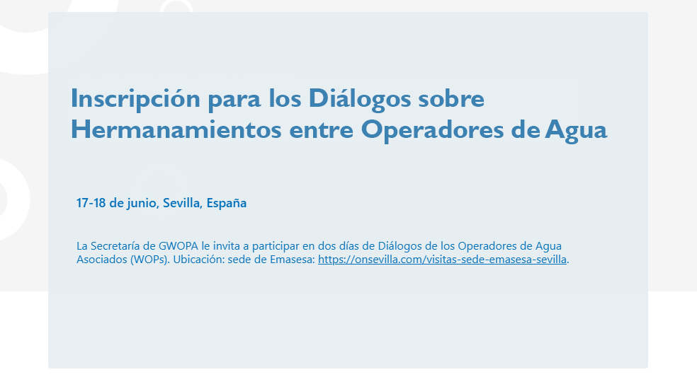 GWOPA creó los Diálogos entre actores clave para compartir y aprender sobre cómo hacer que los hermanamientos entre operadores sean más factibles, eficaces y ampliables. En el ámbito europeo, se han celebrado tres Diálogos hasta la fecha en la ciudad alemana de Bonn, por tanto, la IV edición es la primera en salir de Alemania, para celebrarse en la capital andaluza.
